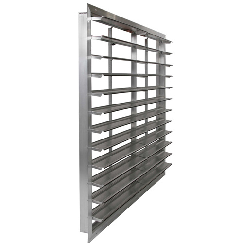 The Model EASR is a COUNTER BALANCED front flanged vertical mount automatic exhaust shutter. It is designed to allow horizontal airflow in one direction and to prevent reverse airflow while providing protection from environmental elements when the airflow stops. The blades open with airflow and minimize the wear load on the fan motor and close by gravity when the fan shuts down. Counter balanced blades allow the shutter to be mounted vertically to 45 degrees and has flanged ends for added weather protection. Ideal for direct-drive or belt-driven exhaust fans. Do not use with vane axial or tube axial fans.